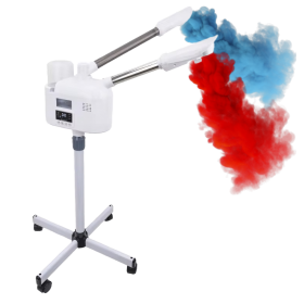 Le vapozone à double tête de vaporisation est un appareil qui permet la brumisation de vapeur d’eau chaude et/ou froide pour la réalisation de soins de la peau ou des cheveux. Le vapozone possède également une lampe de ionisation. Il est réglable en hauteur et les tête sont pivotables à 360°. UTILISATION : On préconise l’utilisation de ce type de machine pour un nettoyage en profondeur. La vapeur d’eau chaude permet : - Ramollit les cellule morte - Permet d’ouvrir les pores - Permet un nettoyage en profondeur La vaporisation à eau froide permet de : - refermer les pores - raffermir la peau - rendre la peau plus lisse - tonifier la peau Possède deux têtes rotatives à 360°.